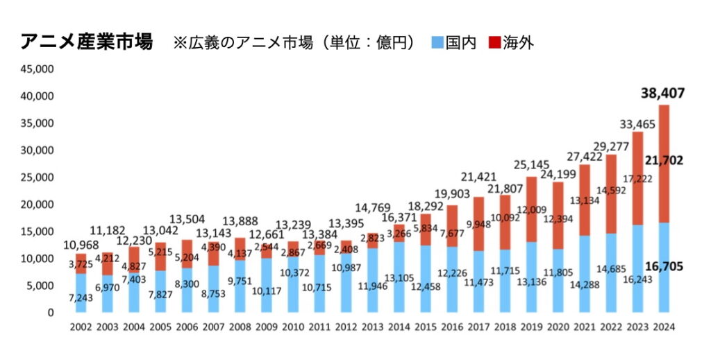 現在、アニメ系Webライターの需要は非常に高まっています。一般社団法人日本動画協会によると、2024年の海外市場は2兆1,702億円(前年比26%増)となり、国内市場の1兆6,705億円を大幅に上回りました。